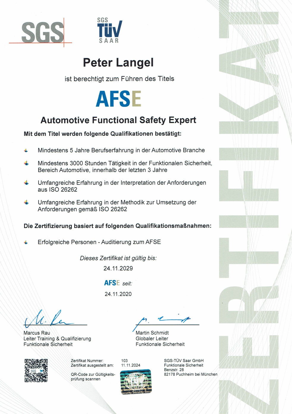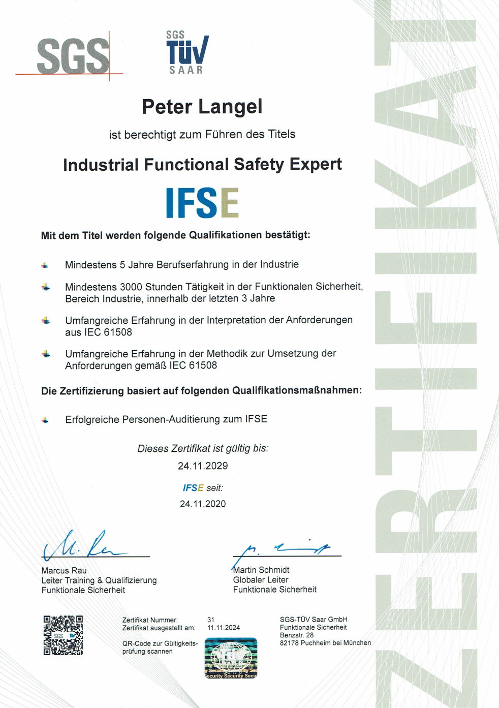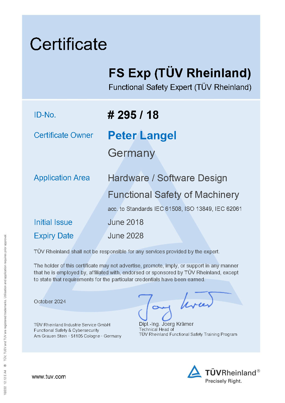 Für den Bereich Automotive (ISO 26262), der Maschinensicherheit (ISO 13849, IEC 62061) und dem Hardware/Software Design nach IEC61508 verfüge ich über unabhängige Zertifikate